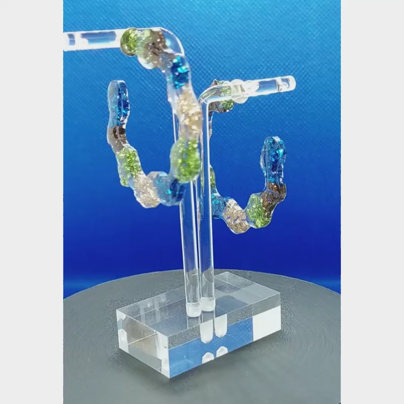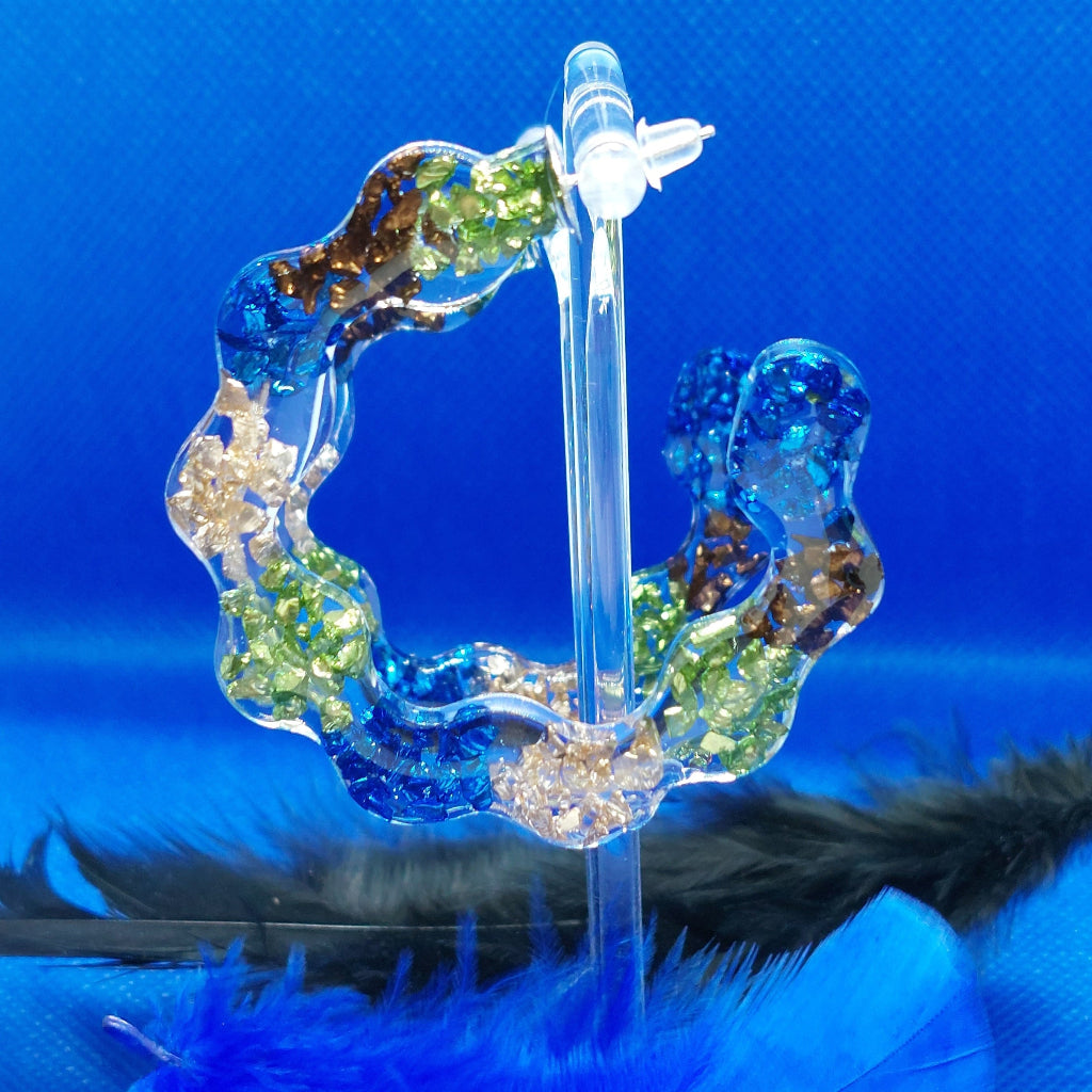 Stone Hoop Earrings with crushed blue, brown, green and gold rock in a Resin Hoop.